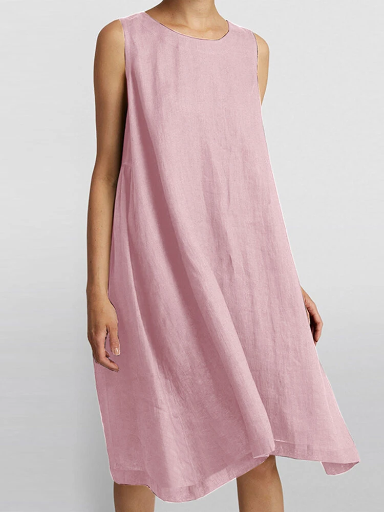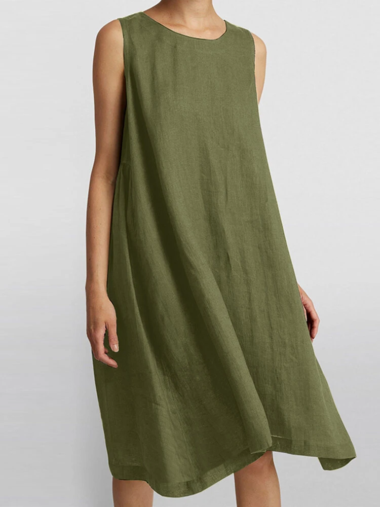 Women Solid Crew Neck Cotton Casual Sleeveless Dress