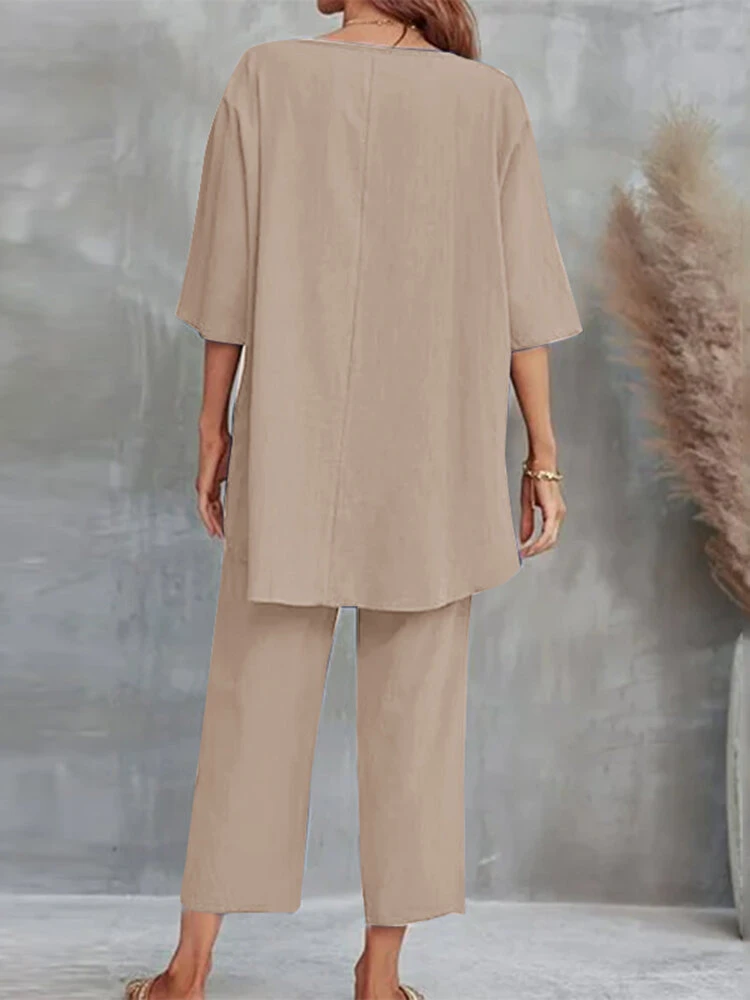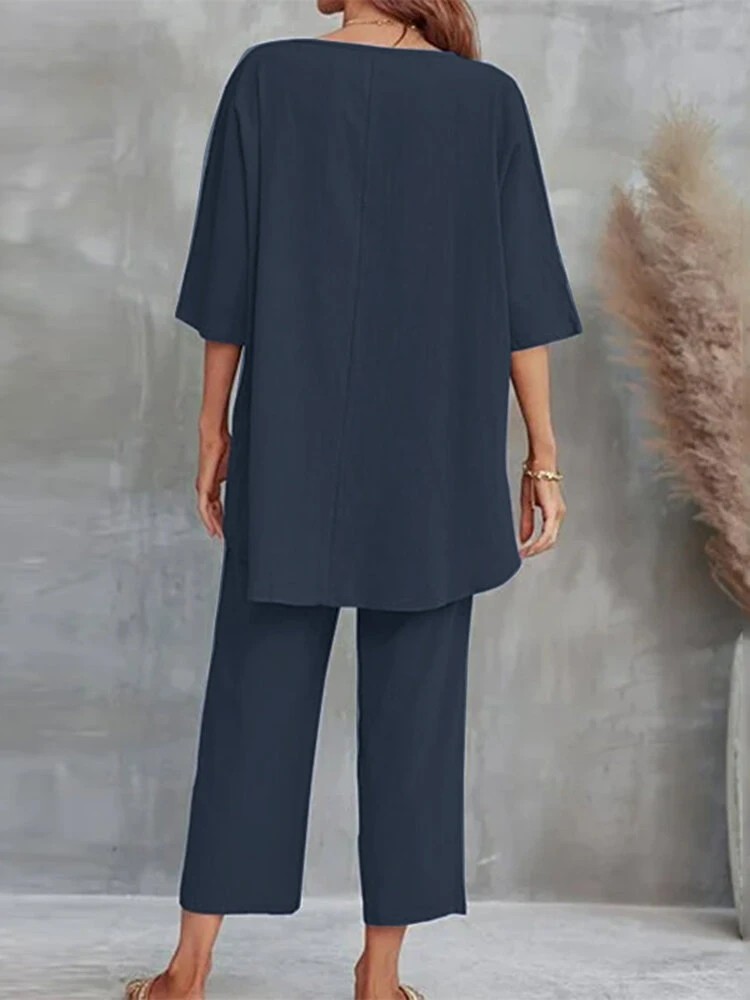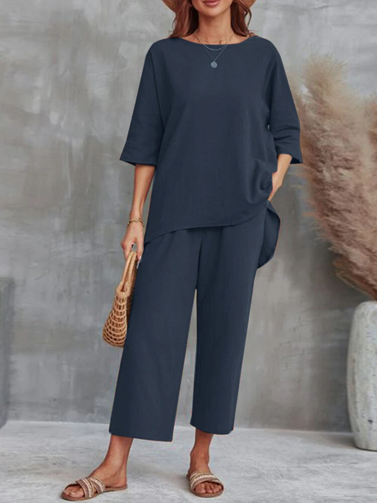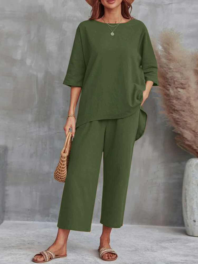 Women Solid Crew Neck High-Low Hem Cotton Co-ords