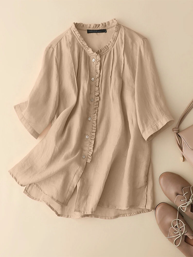 Women Solid Frill Trim Button Front Cotton 3/4 Sleeve Shirt