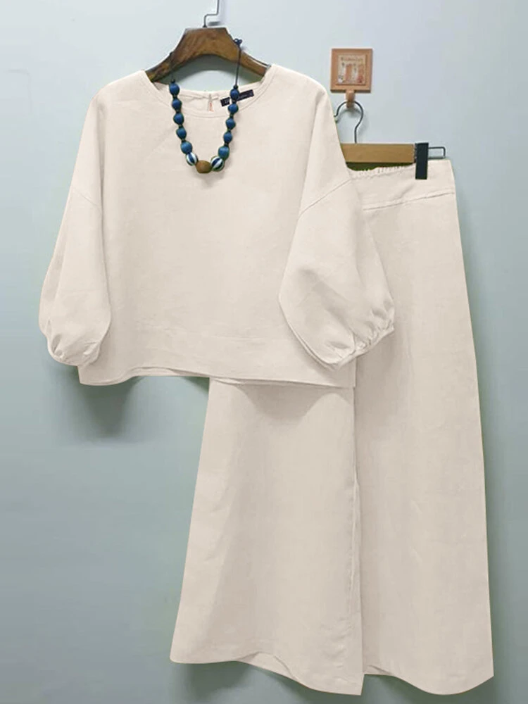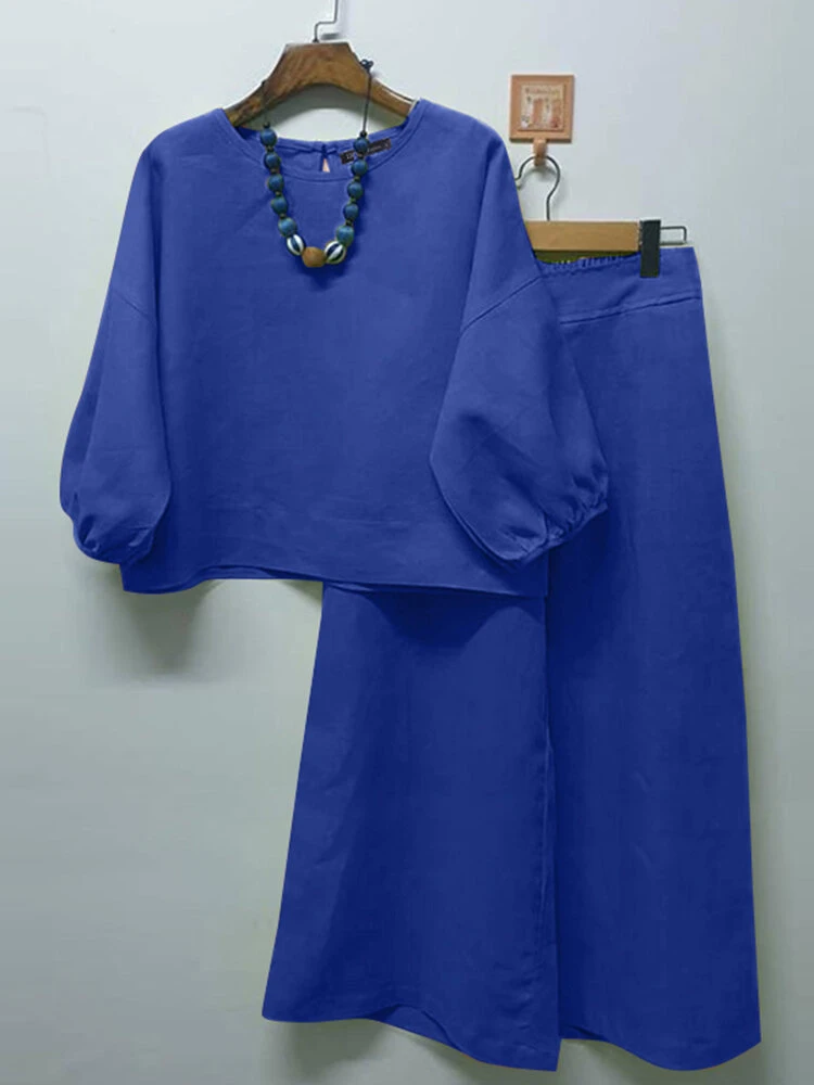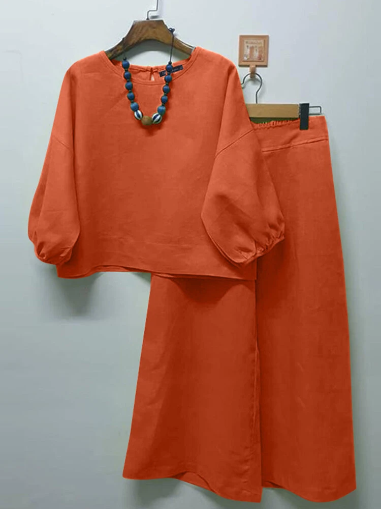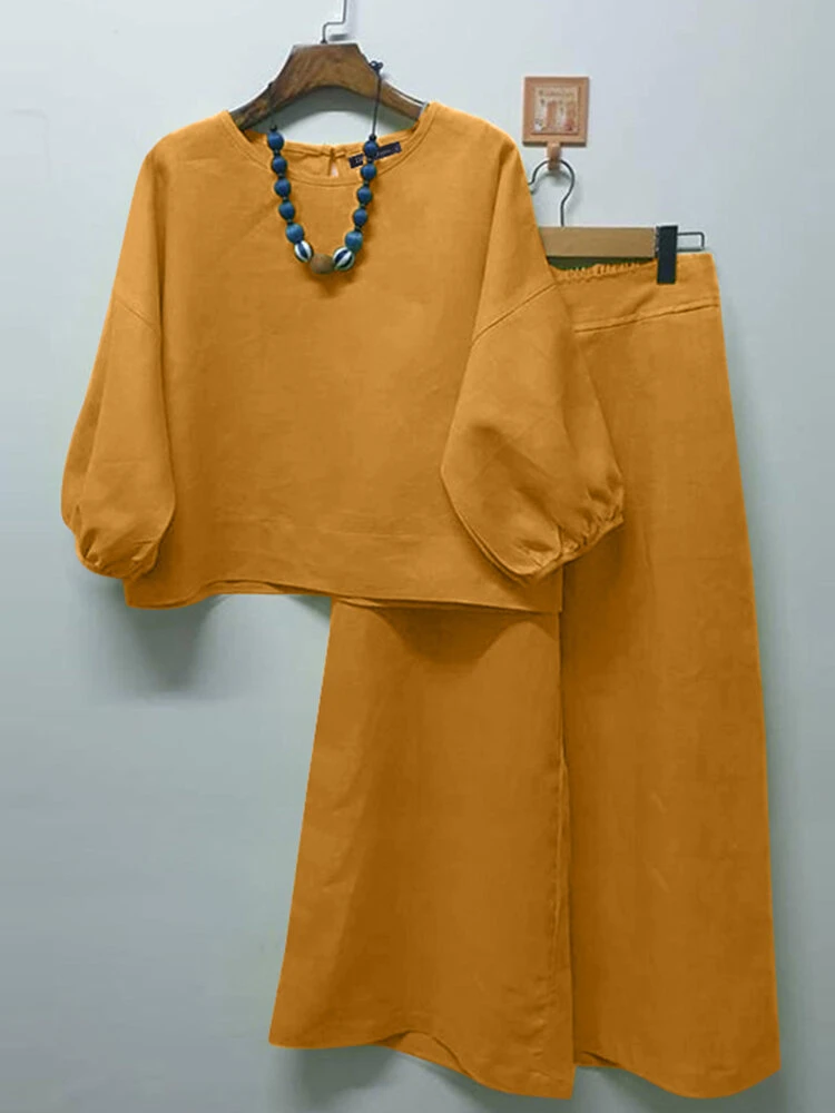 Women Solid Lantern Sleeve Flared Pants Casual Co-ords