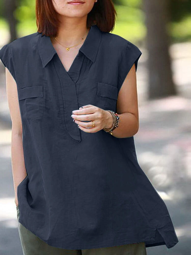 Women Solid Lapel Cap Sleeve High-Low Hem Blouse
