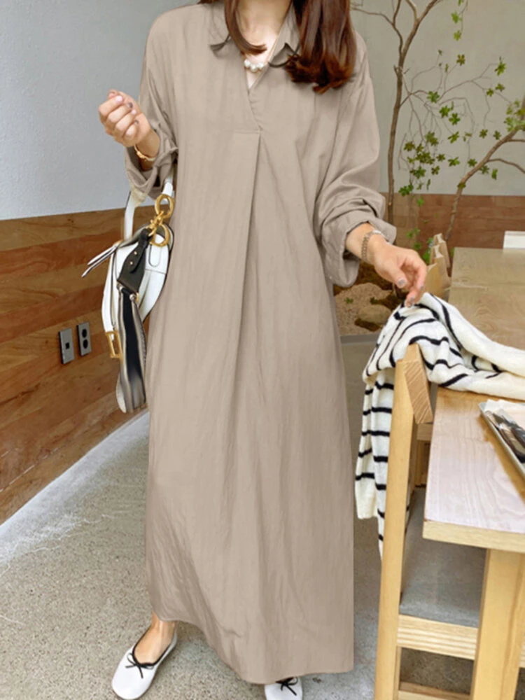 Women Solid Long Sleeve Lapel Shirt Maxi Dress