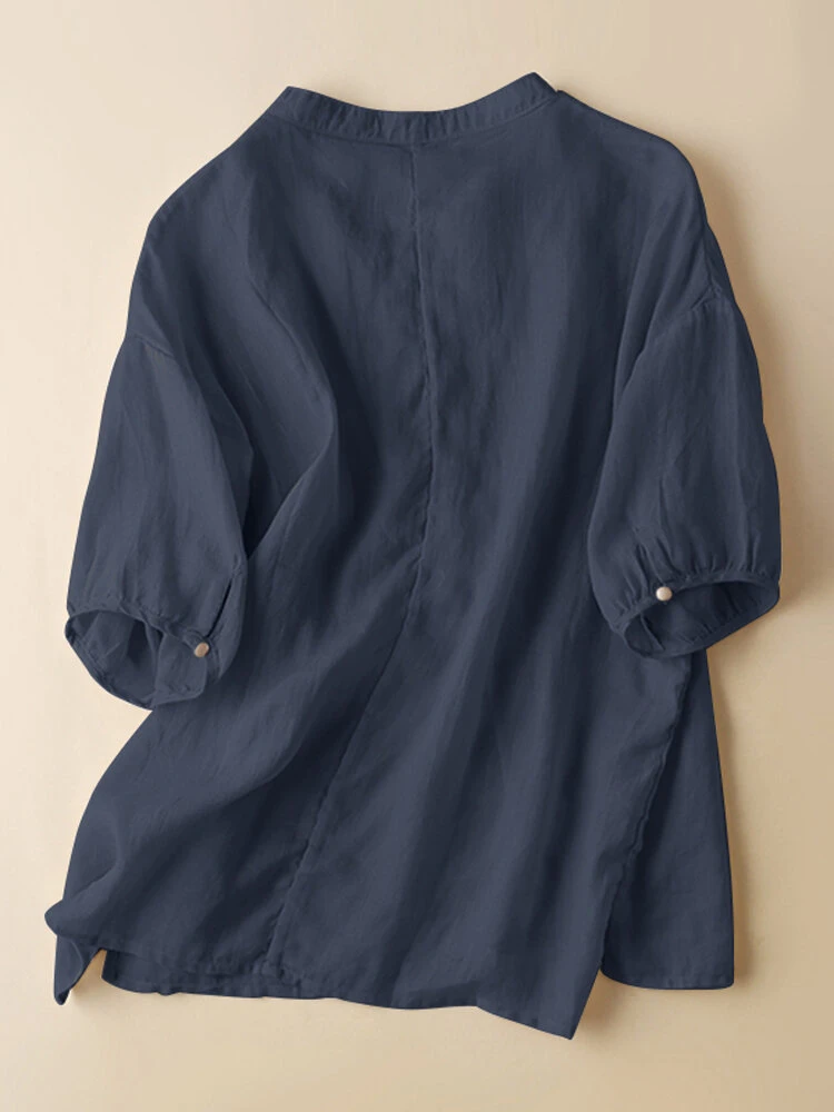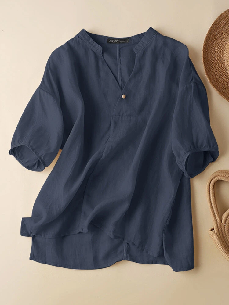 Women Solid Notch Neck High Low Hem Cotton Blouse