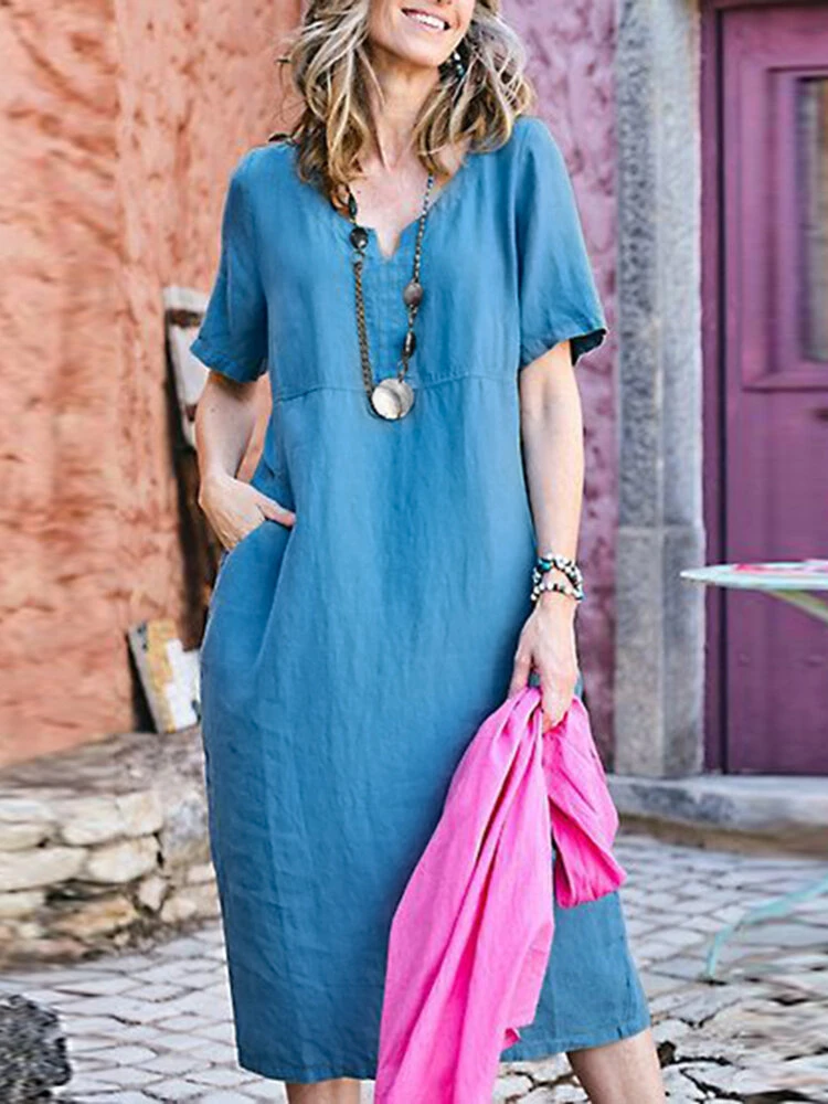 Be the first to review “Women Solid Notched Neck Cotton Short Sleeve Dress” Cancel reply