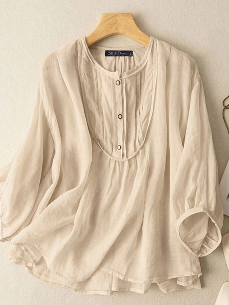 Women Solid Pleated Crew Neck Button Design Puff Sleeve Blouse
