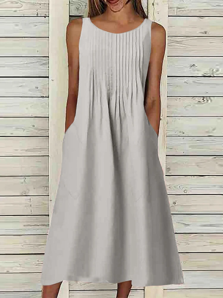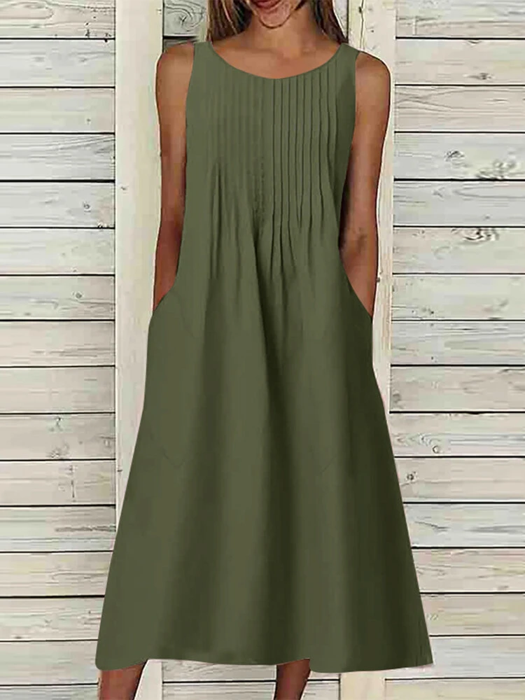 Women Solid Pleated Crew Neck Casual Sleeveless Dress