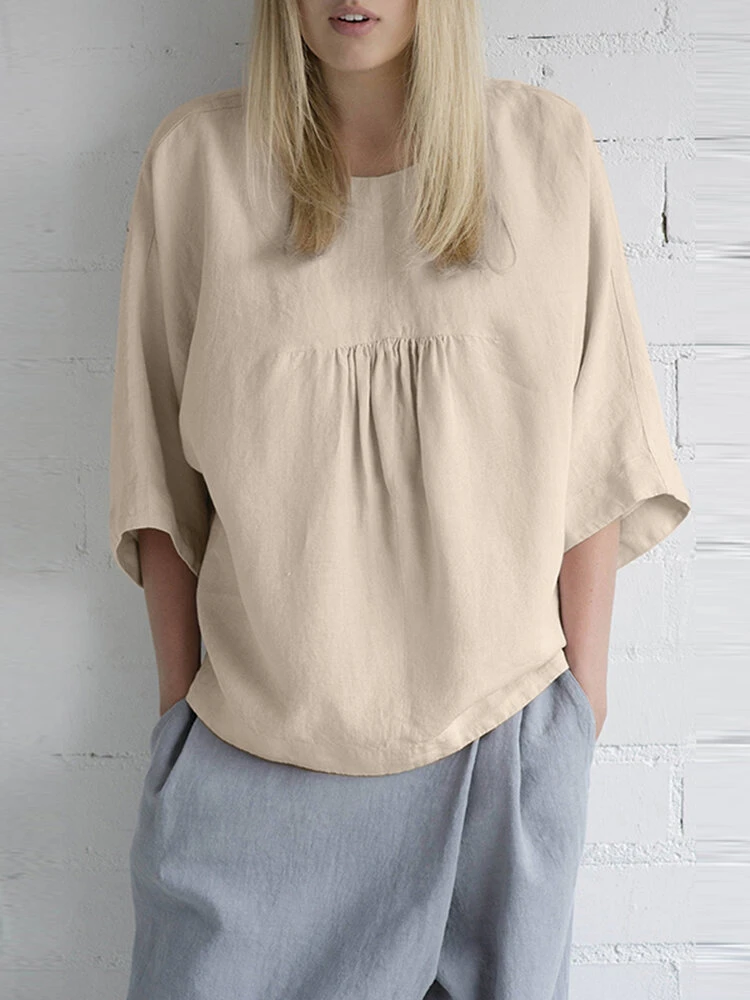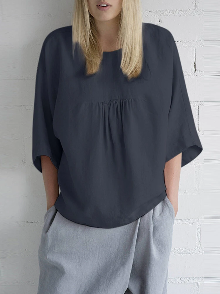 Women Solid Pleated Crew Neck Cotton 3/4 Sleeve Blouse