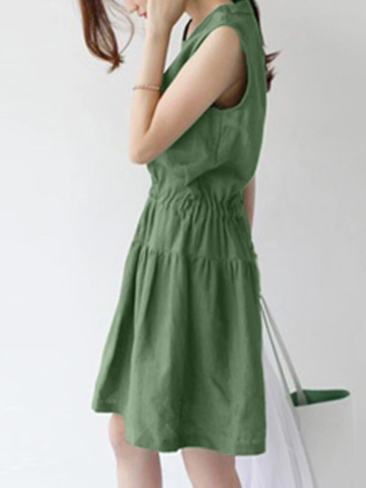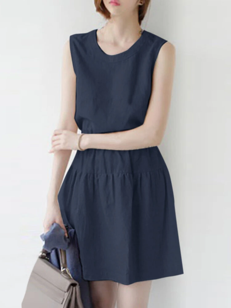Women Solid Pleated Crew Neck Cotton Casual Sleeveless Dress