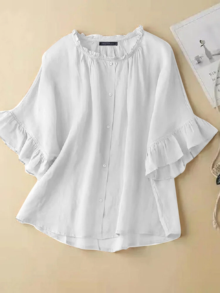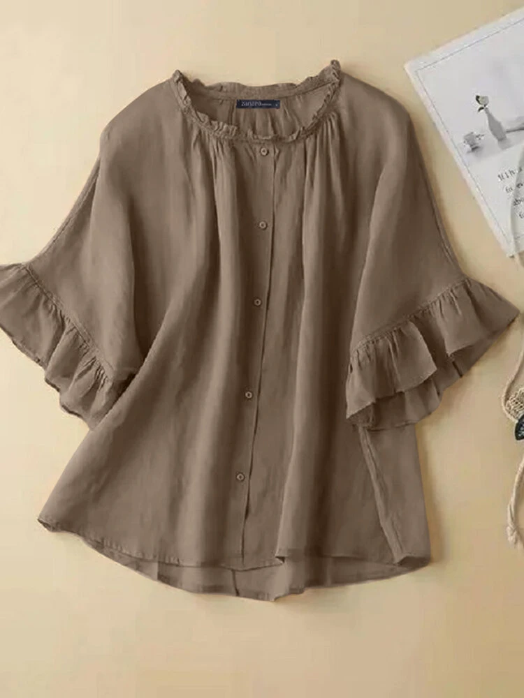 Color: Khaki, White, Navy, Green Material: Polyester Pattern: Plain Occasion: Office chic Style: Casual Sleeves Type: Ruffle Sleeves Collar: Crew Neck Season: Summer Package Included:1*Blouse