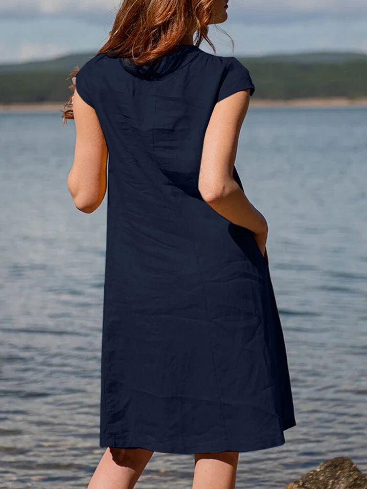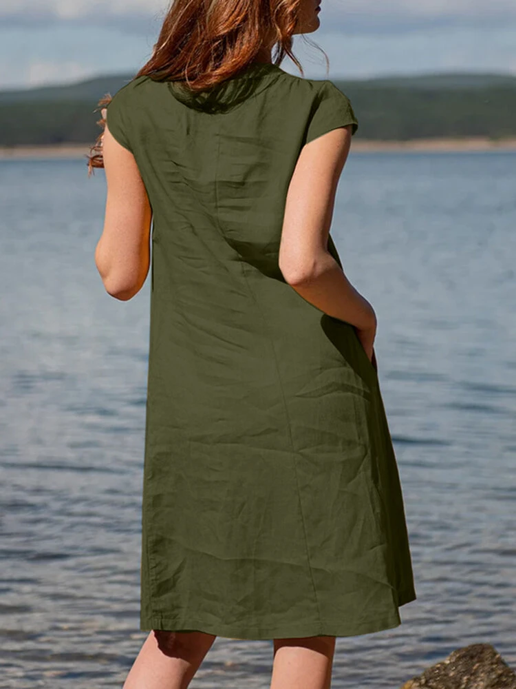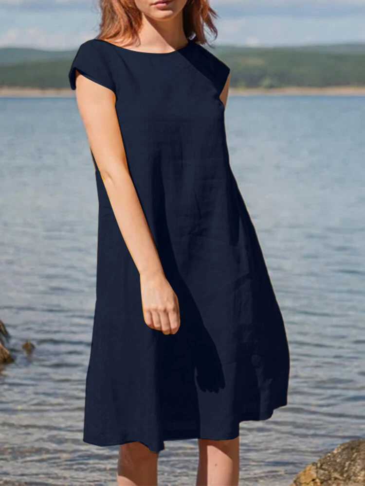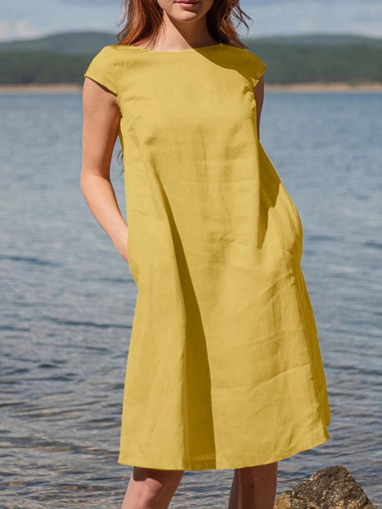 Color: Navy, Khaki, Green, Yellow Style: Casual Occasion: Everyday Material: Linen, Polyester Pattern: Plain Design Element: Pocket Season: Summer Collar: Crew Neck Sleeves Length: Short Sleeve Package Included:1*Dress