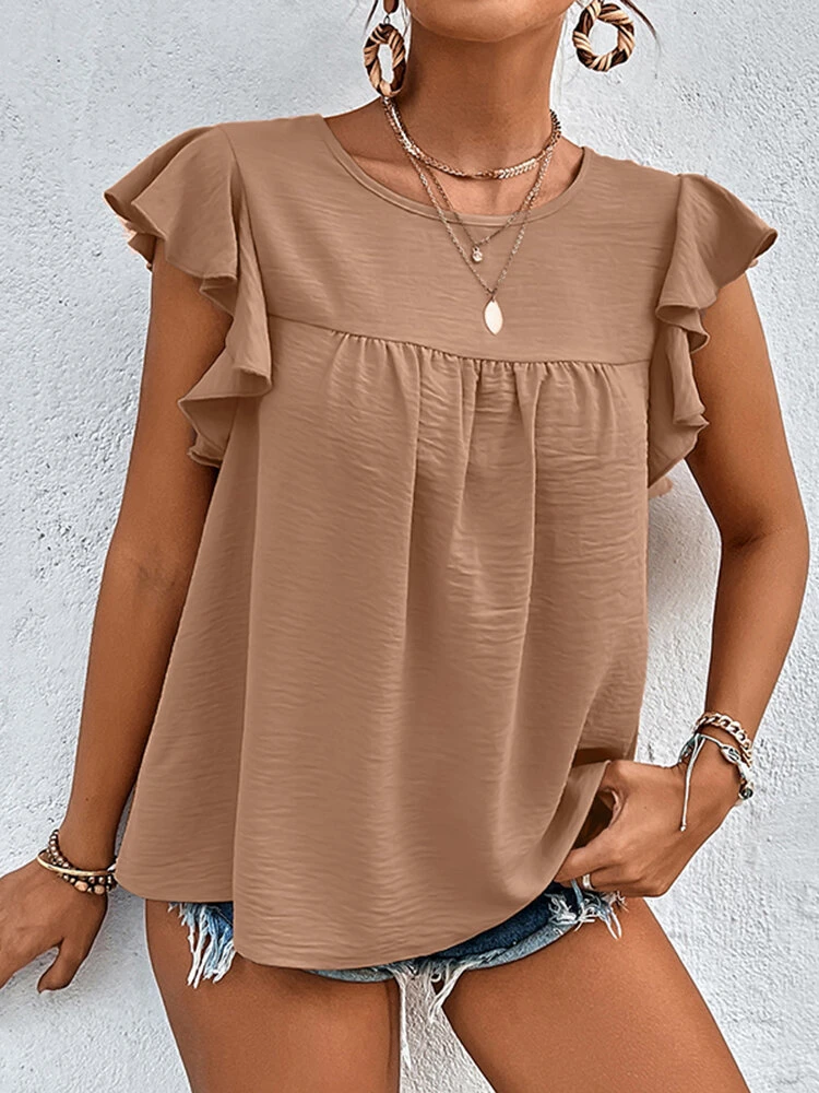 Women Solid Texture Crew Neck Ruffle Sleeveless Blouse