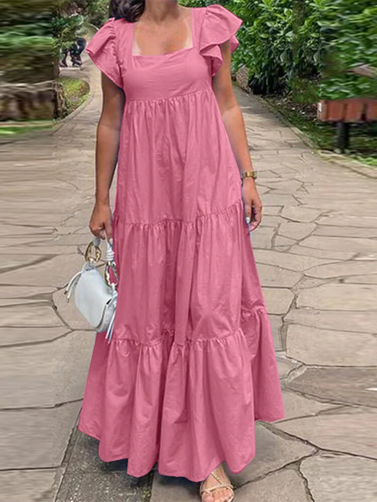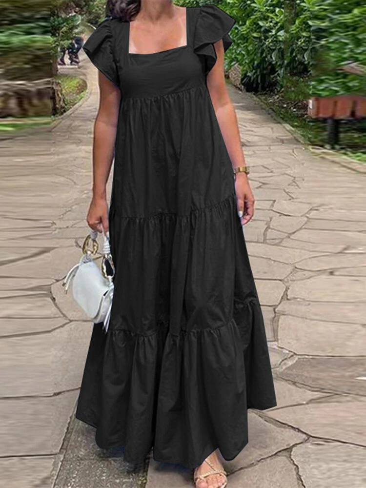 Women Solid Tiered Square Collar Ruffle Sleeve Maxi Dress