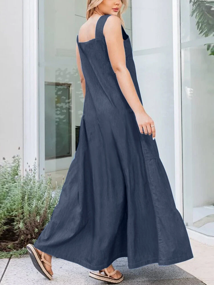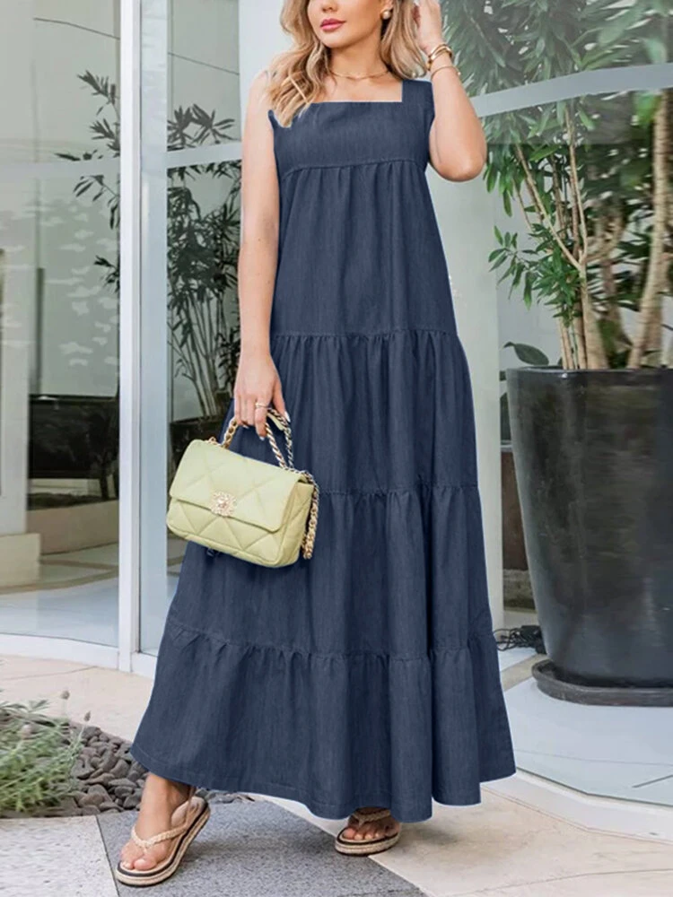 Women Solid Tiered Square Collar Sleeveless Denim Maxi Dress
