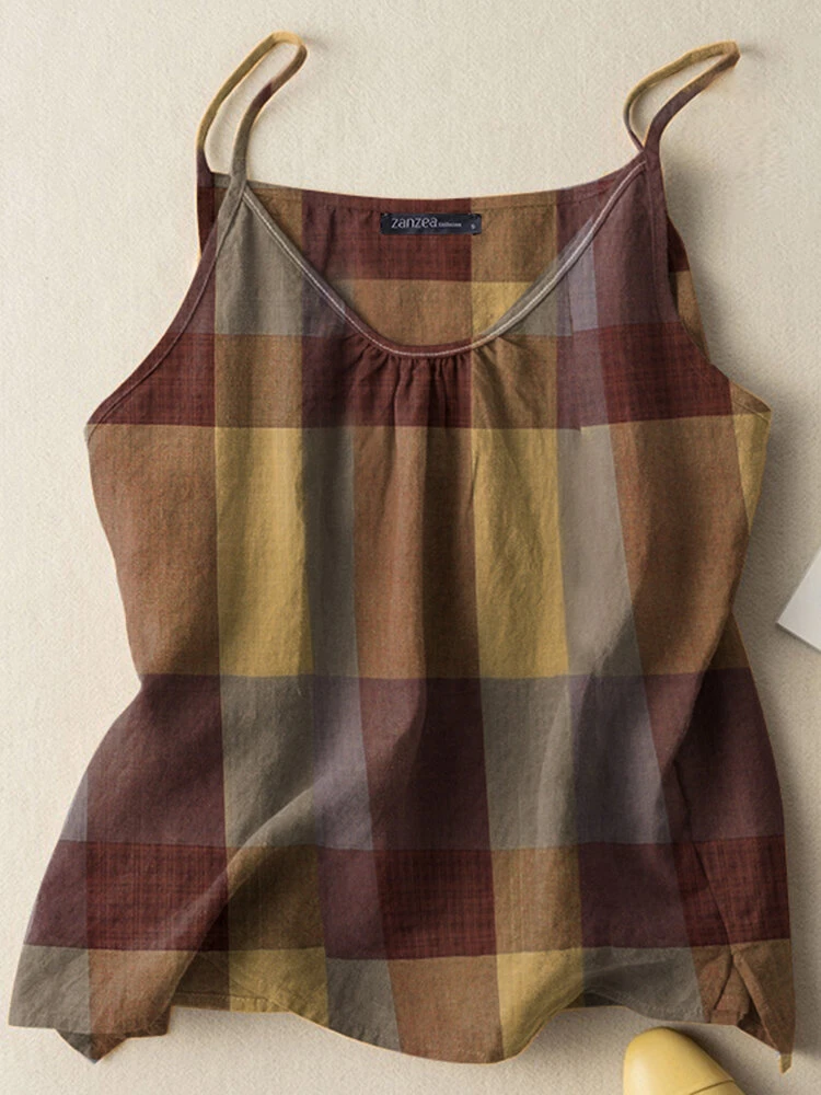 Women Vintage Plaid Casual Spaghetti Strap Cami