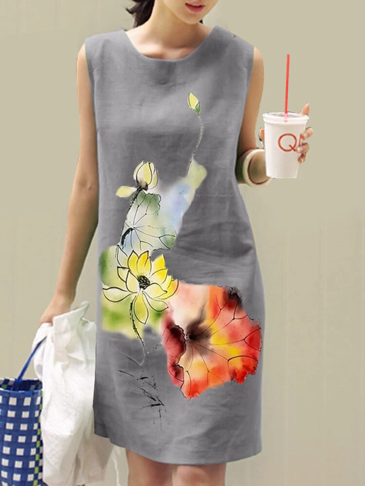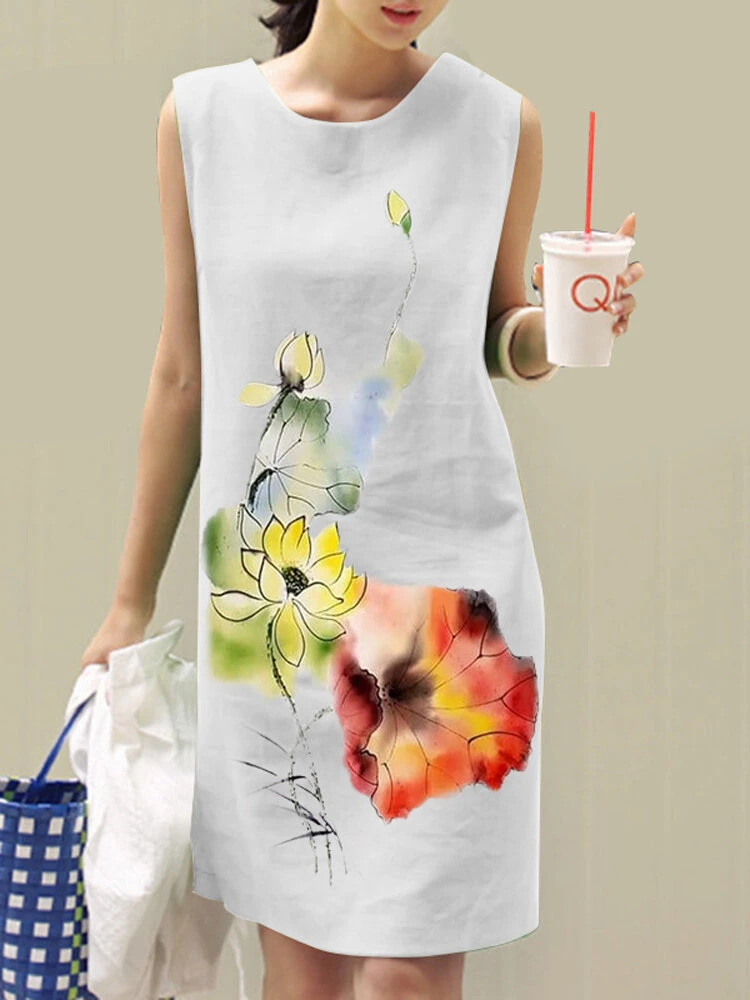 Women Watercolor Lotus Print Crew Neck Sleeveless Dress